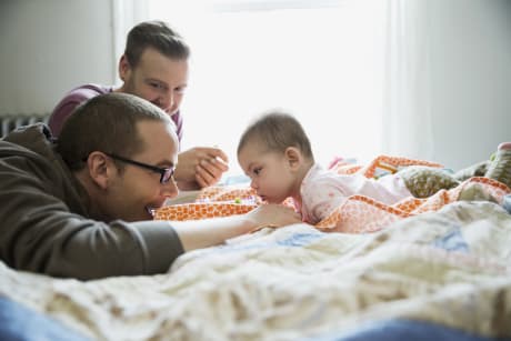 • Don't share a bed (co-sleep) with your baby. Bed-sharing has been shown to raise the risk for SIDS. The American Academy of Pediatrics advises that babies sleep in the same room as their parents, close to their parents' bed, but in a separate bed or crib appropriate for babies. This sleeping setup is advised ideally for the baby's first year, but at least for the first 6 months.
