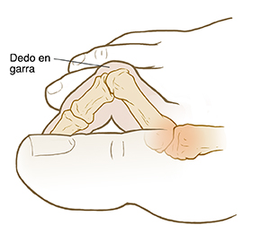 En el dedo en garra, la articulación en la base del dedo está doblada hacia arriba y la del medio, hacia abajo.